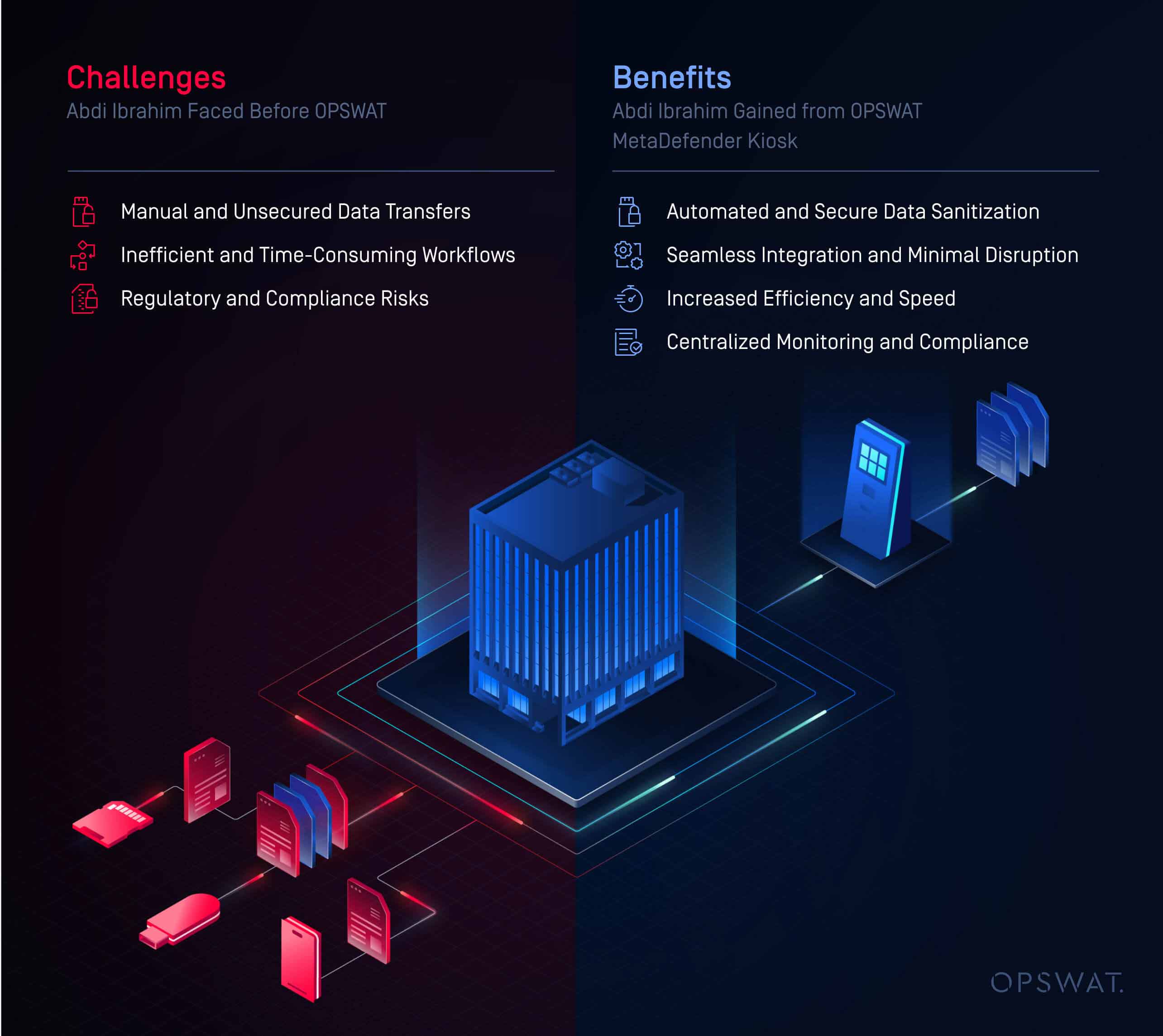 慎重に検討した結果、アブディ・イブラヒム氏のセキュリティ・チームはOPSWATを選択した。 MetaDefender Kioskを、安全なファイル転送を通じてマルウェアやデータ漏洩を防止するための周辺メディア保護ソリューションとして選択しました。