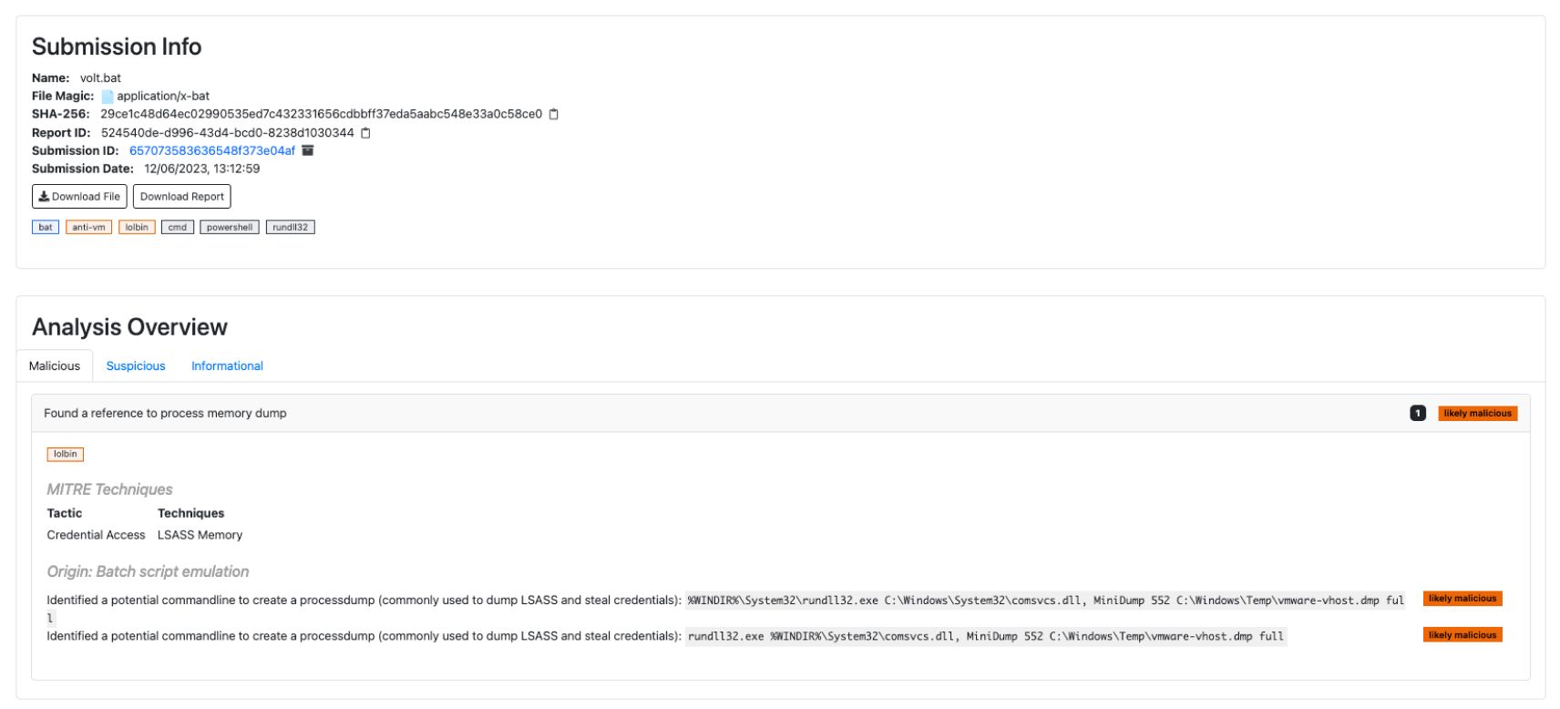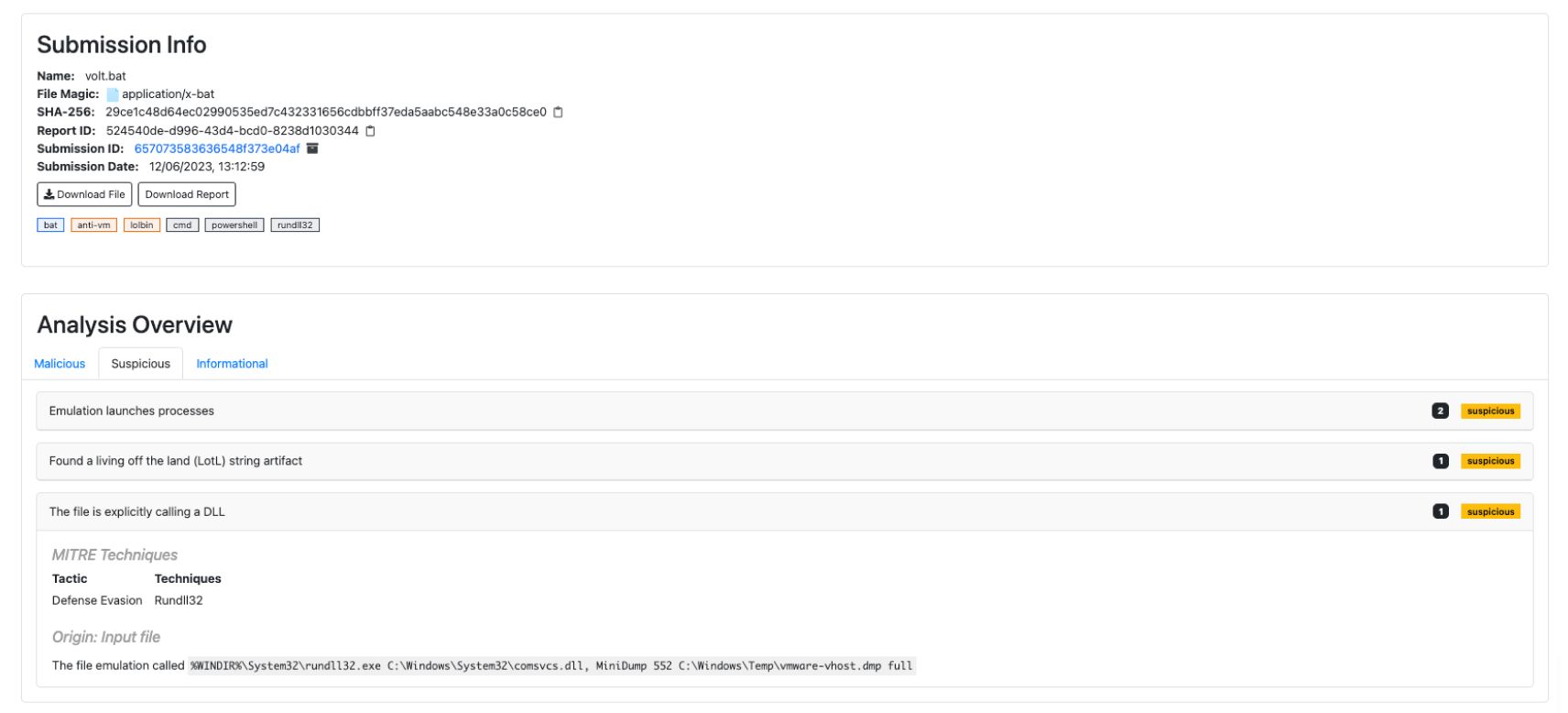 OPSWAT Adaptive Sandbox、社内のアナライザやYaraルールのような広く知られているものを使用して、脅威インジケータの異なるセットを組み合わせます。以前に言及したVolt TyphoonとSandwormの攻撃はどちらも、MetaDefender Sandbox 多くの指標を実装しているLiving-Off-the-Landバイナリ(LOLBINS)に大きく依存していました。しかし、最も初期の攻撃は、サンプルの利用可能性により、インジケータの組み合わせの良い例を提起しています。最初に報告されたペイロードは、base64でエンコードされたPowershellコマンドを含むバッチスクリプトであり、特にこのケースでは2つの興味深いインジケータをトリガします。