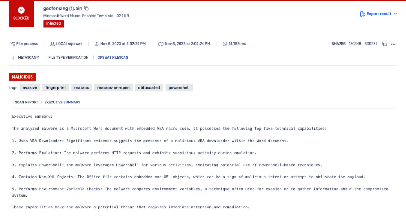 とOpenAI GPT Model Executive Summaryを統合しました。 MetaDefender SandboxOPSWAT Filescan Sandbox(MetaDefender Core バージョン1.5.0は、セキュリティ洞察の伝達を合理化し、強化する上で重要な進歩を意味します。その最も顕著な利点は、SOC アナリスト、特に初級レベルのアナリストが複雑な脅威をより迅速に理解できるようになることにあります。作業負荷の増大に悩まされているサイバーセキュリティの状況において、脅威の理解を簡素化できることは、高度に専門化された人材の必要性を低減します。