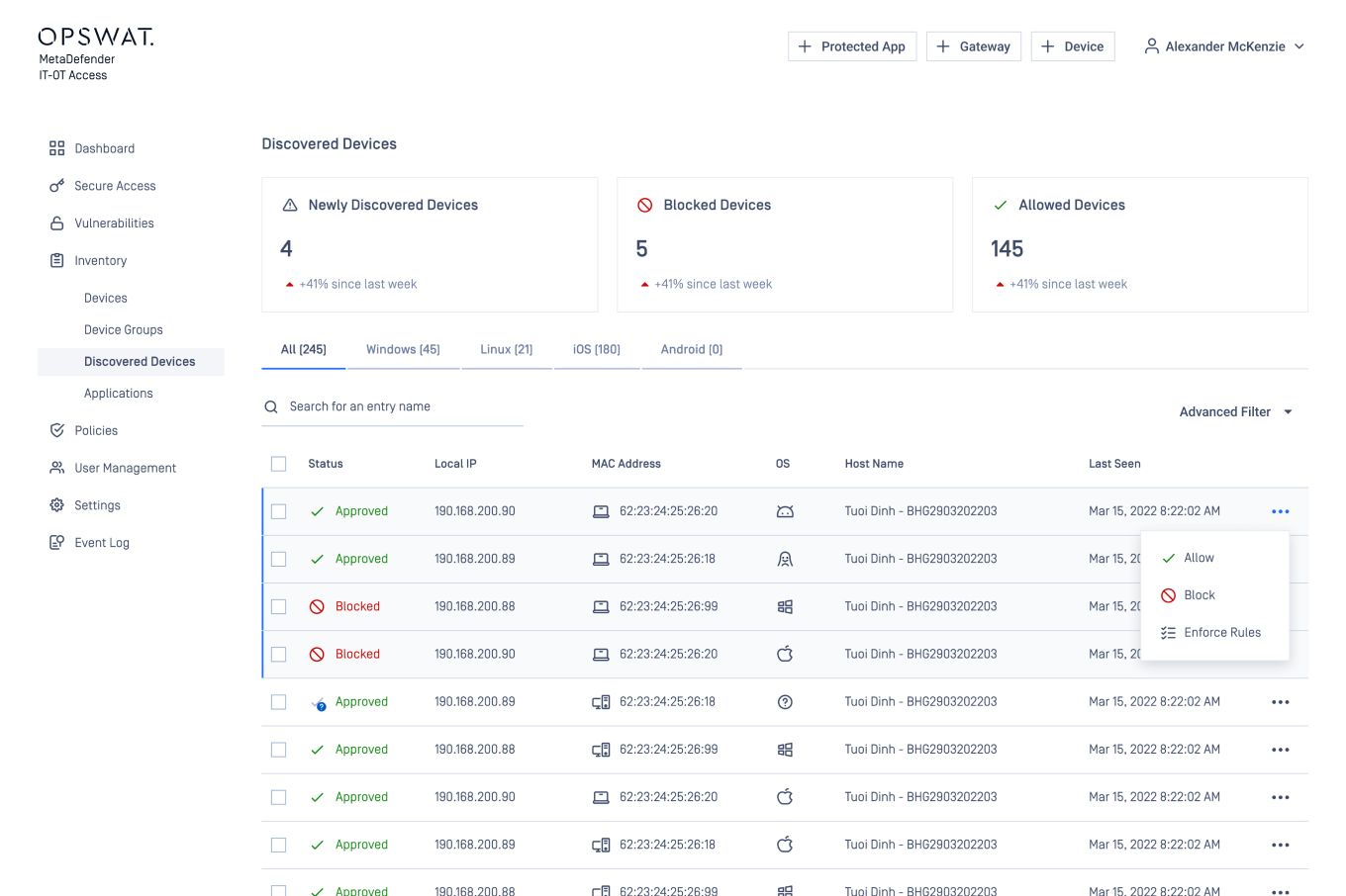 MetaDefender アクセス・ダッシュボード管理は、1 つのインターフェイスから必要な可視性と管理ツールを提供する。組織は、アクセス方法がセキュア・アクセスであるか、従来のSAML/IDP統合であるかを問わず、ネットワークにアクセスしたデバイスの数を合計で確認できる。また、どれだけのデバイスが準拠しているかを把握し、特定のデバイスにドリルダウンして問題を理解することもできます。エグゼクティブ・アクセスがすぐに必要な場合は、デバイスを選択してアクセスを許可する。