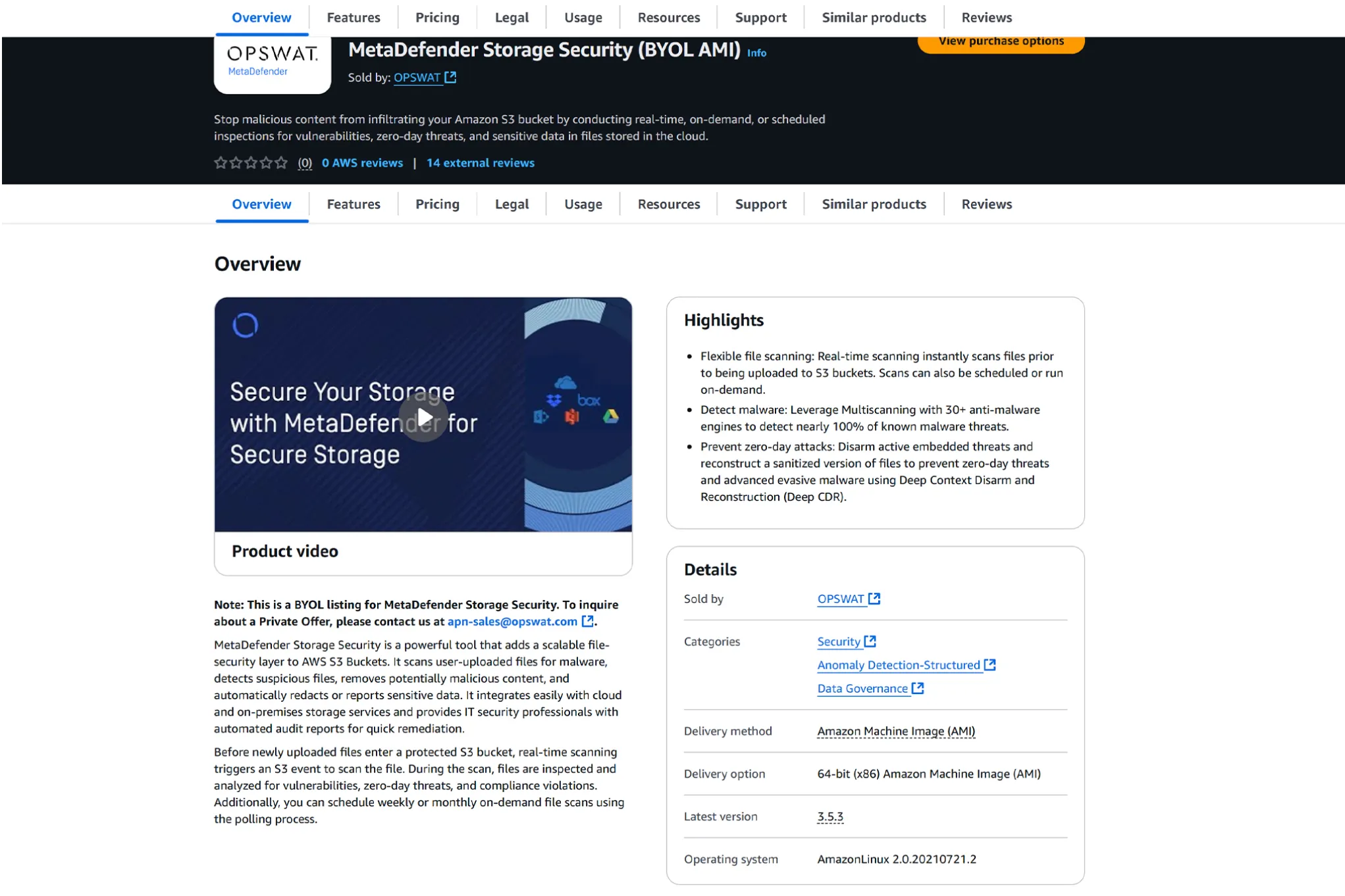 このような実装については、AWS Market Place でMetaDefender forSecure Storage を検索してください。ライセンスについては、お近くのOPSWAT リセラーにお問い合わせいただくか、弊社までお問い合わせください。